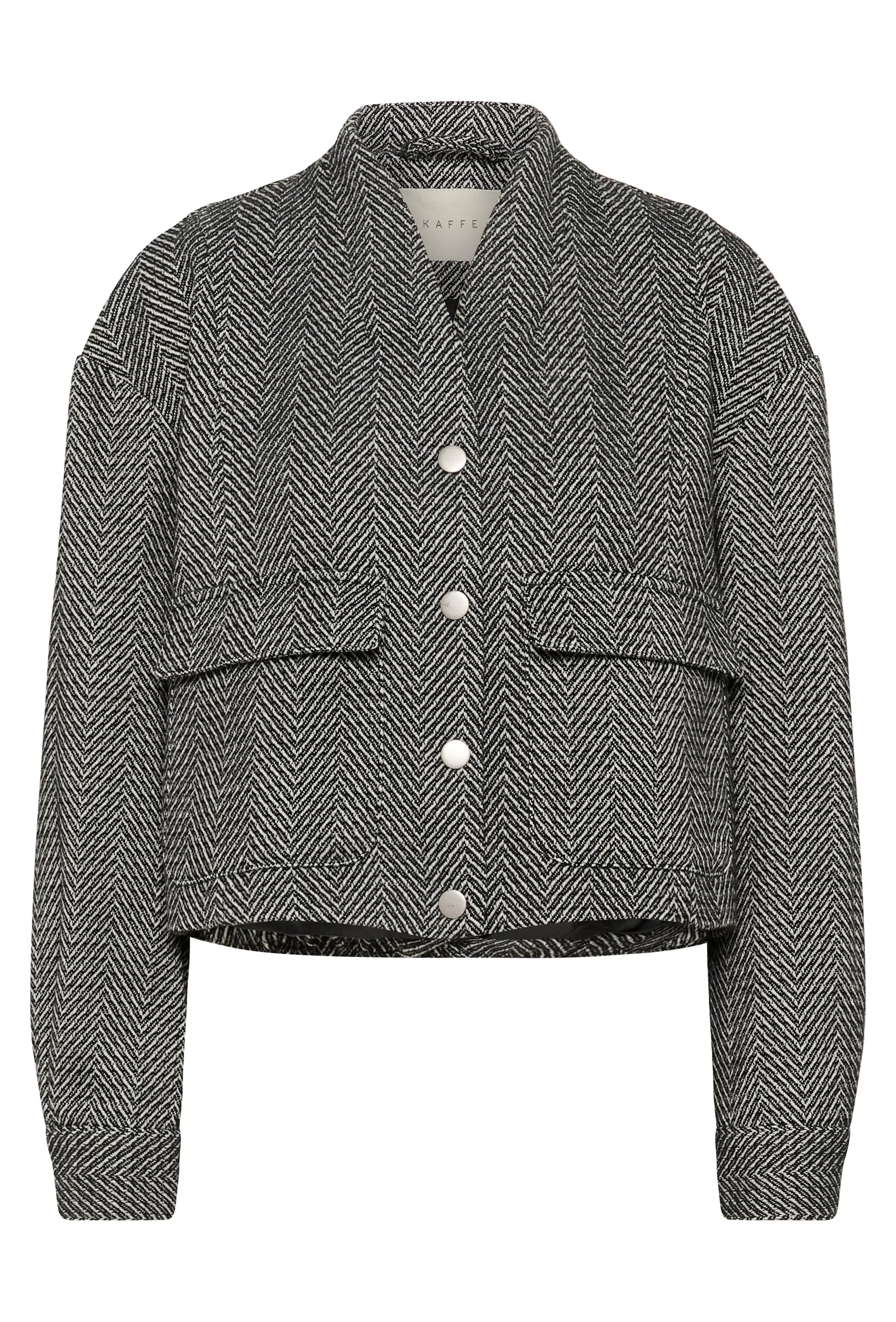 Description: Herringbone jacket features a boxy silhouette, snap button front, long sleeves, and structured patch pockets.