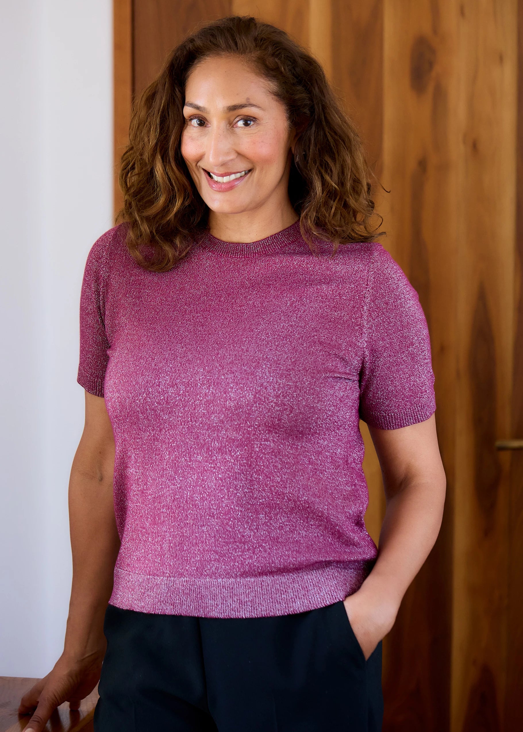 Cashmere Like Short Sleeve Crew Neck Jumper With Metallic Thread - Black or Wine