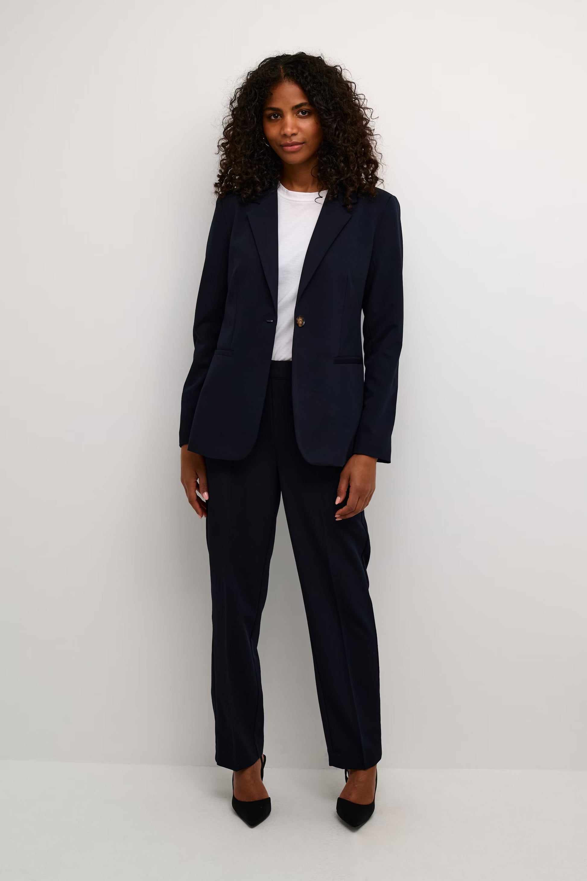 Description: Full length trousers with a straight leg and pressed crease. Designed with a clean waistband, discreet side pockets and belt loops. The structured fabric and relaxed fit offer a smart look with everyday comfort.
