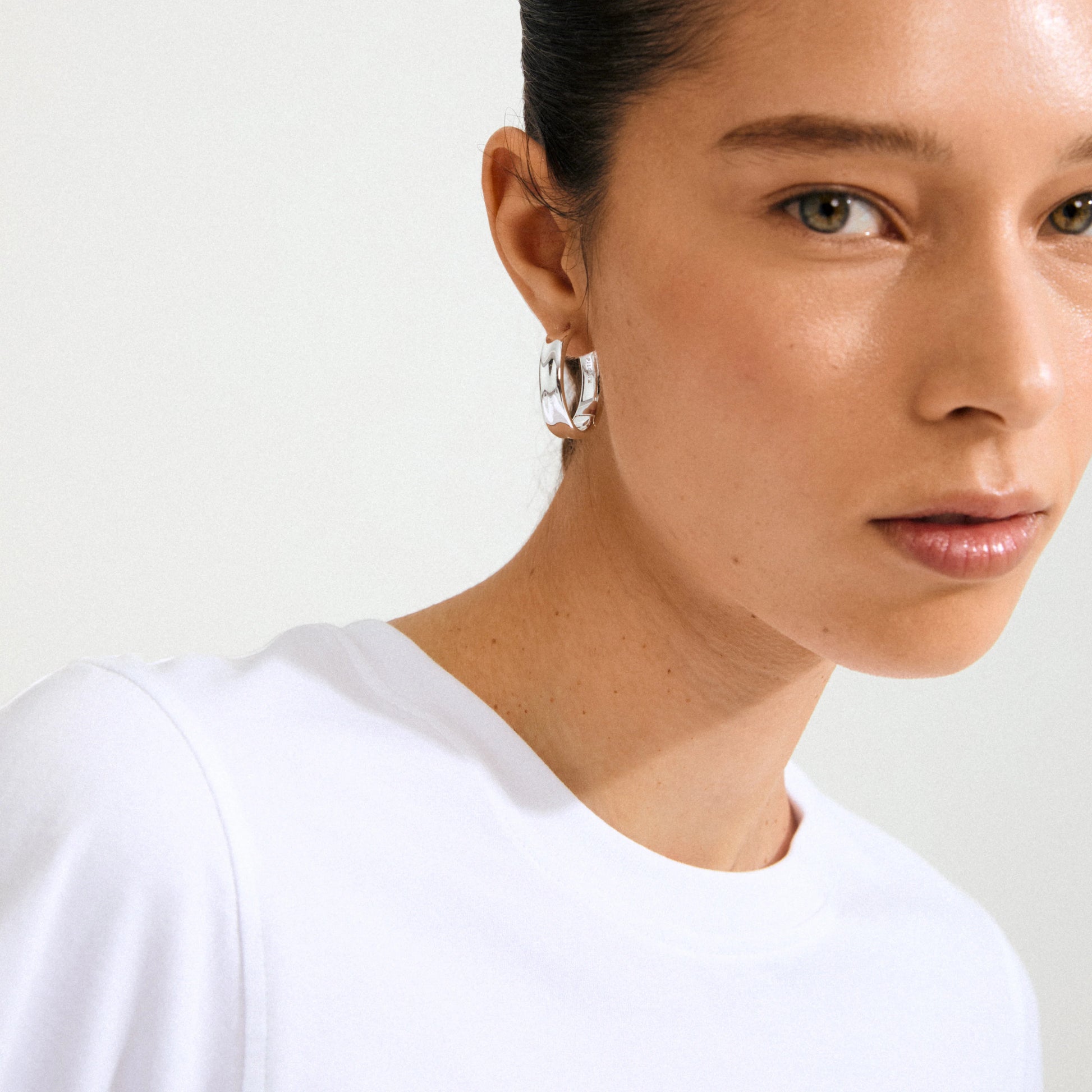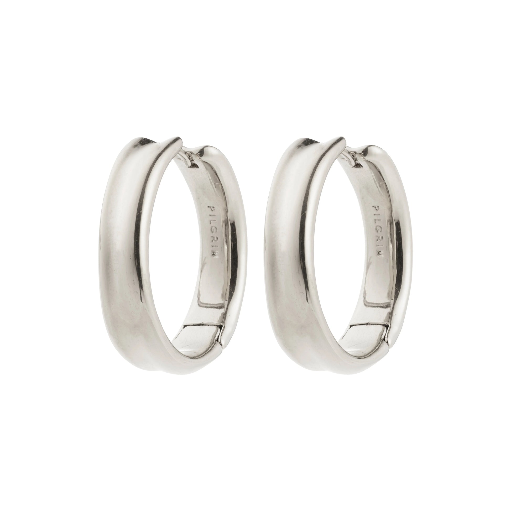 Description: Wherever you go! The silver-plated KAYDEN hoops from Pilgrim infuse Scandi coolness into your style with their broad, bold design. The earrings' shiny finish and minimalist design exude an exclusive aura, while light click clasps make them easy to wear—ideal for a clean look or layered with favorites for a trendy style.