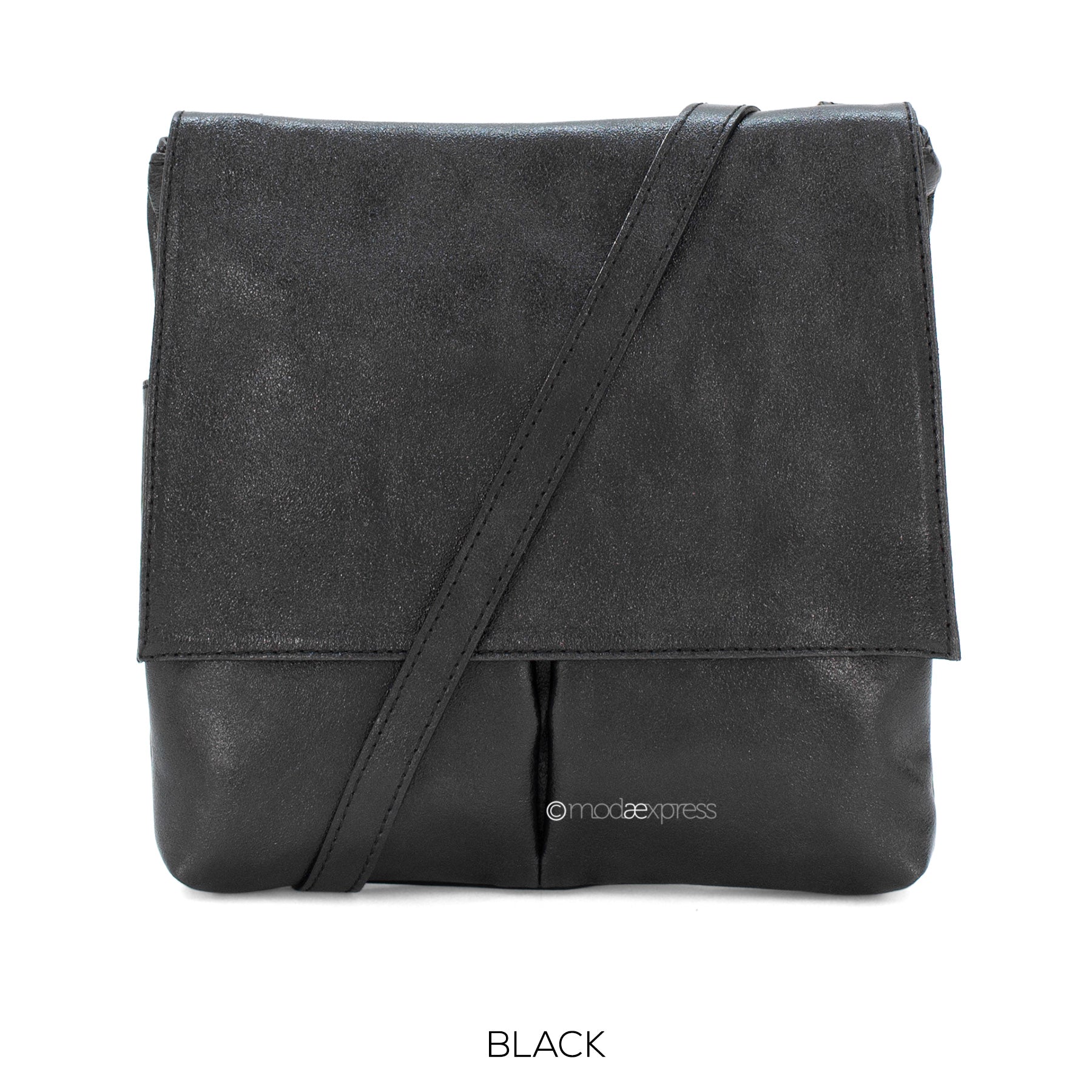 Leather Crossbody Bag with Two Pockets - Metallic Black