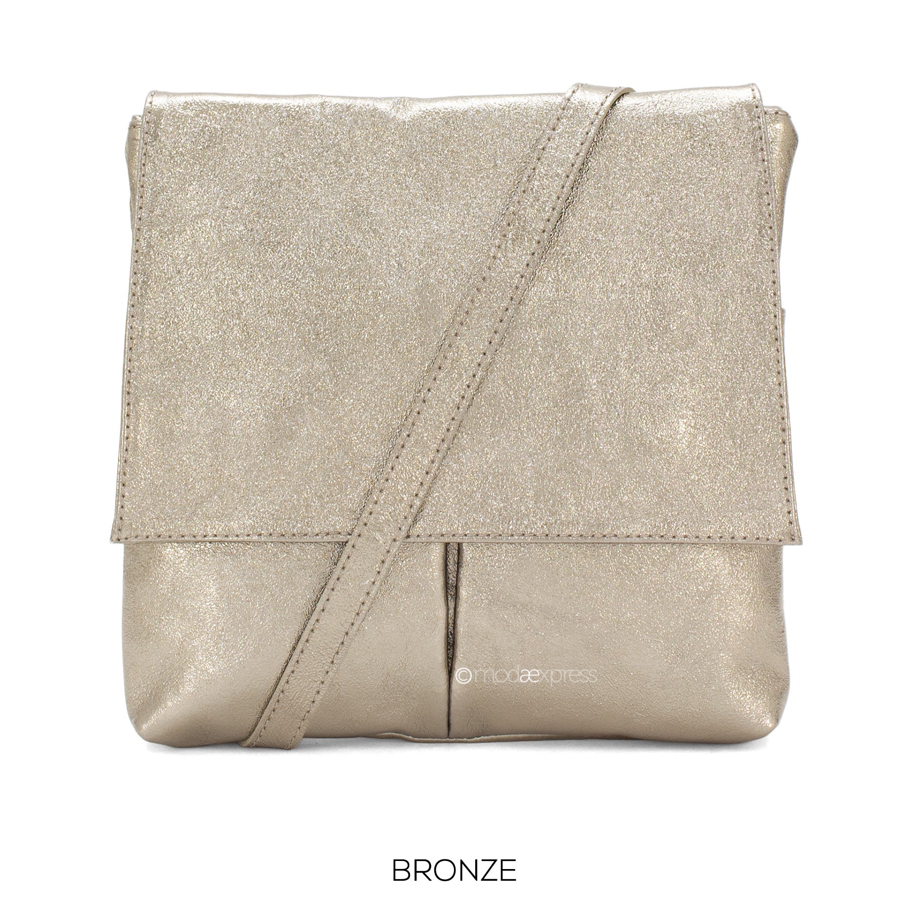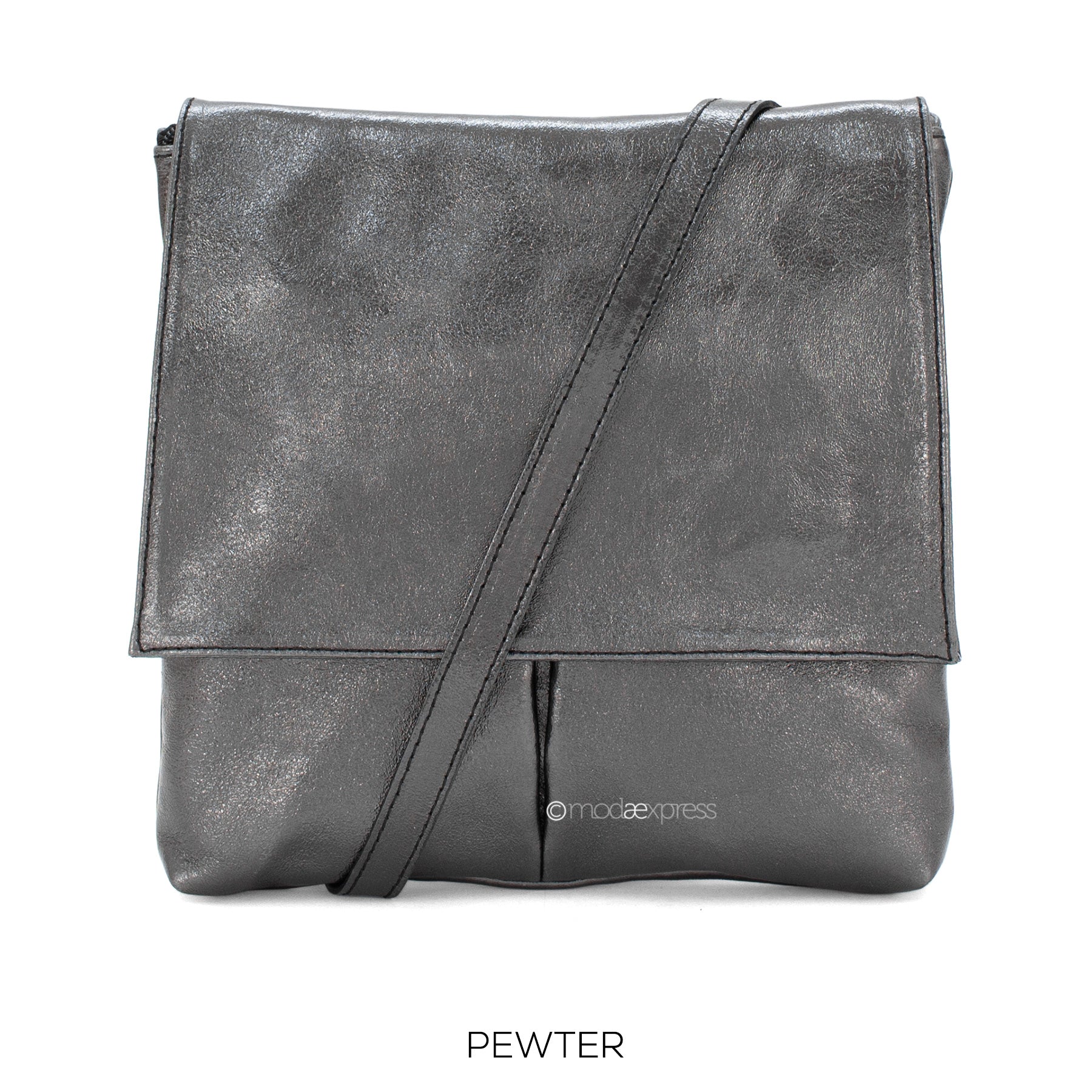 Leather Crossbody Bag with Two Pockets - Metallic Pewter
