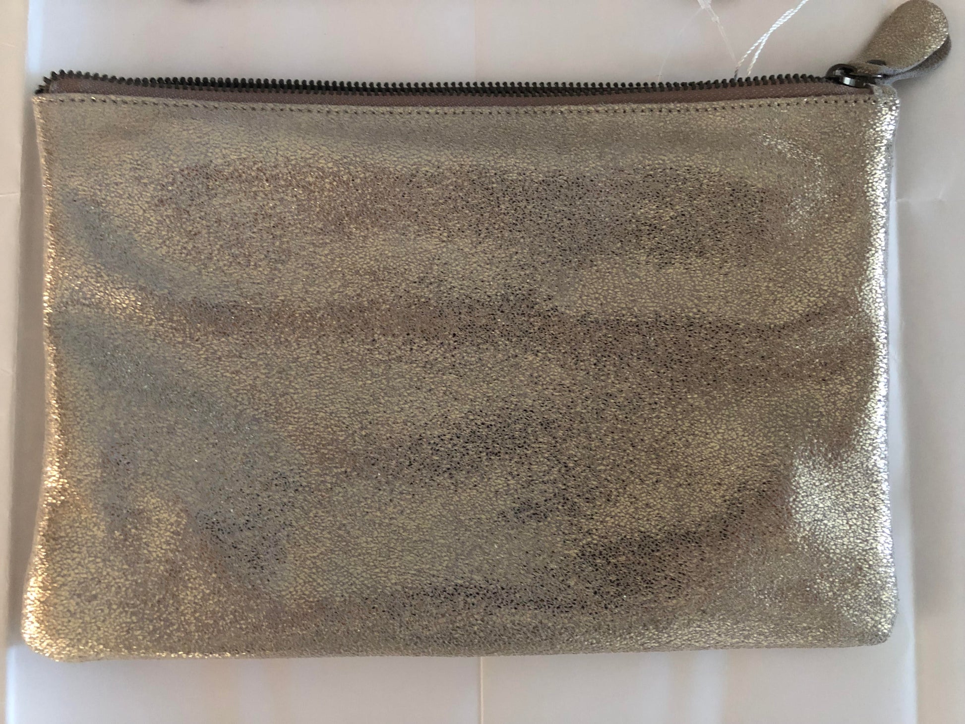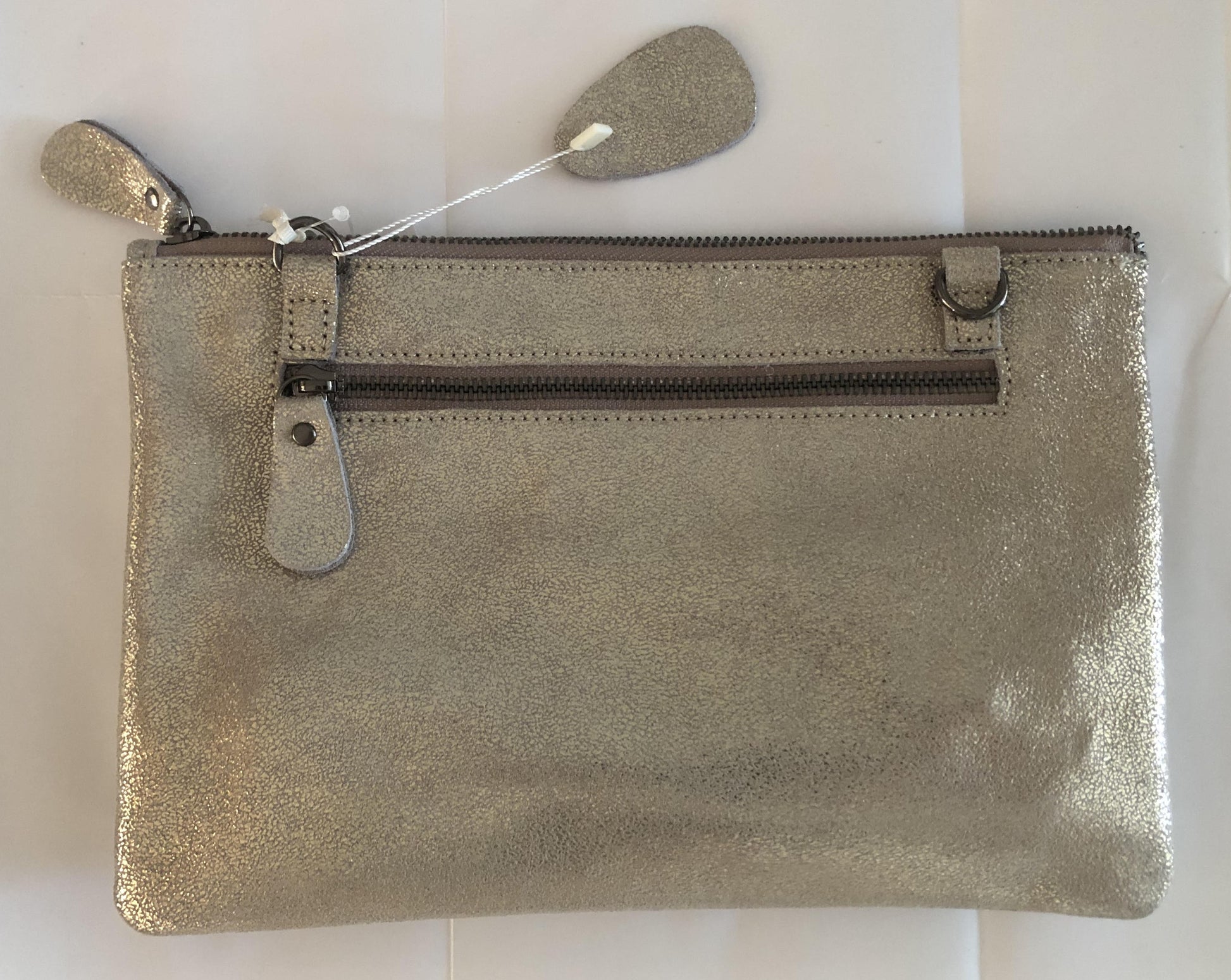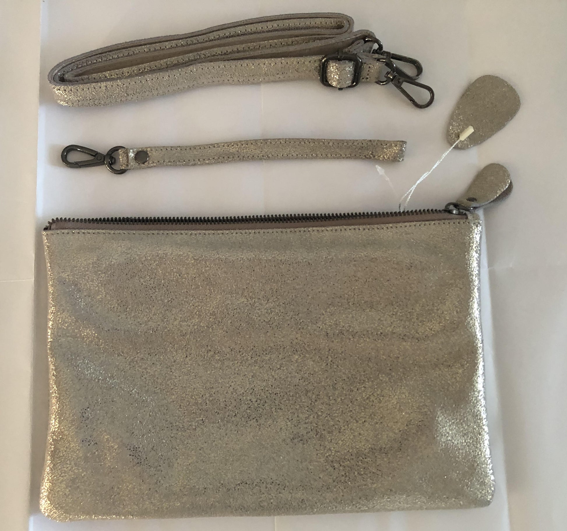 Leather Zip Top Clutch Bag With Detachable Wrist Strap & Long Strap - Gold