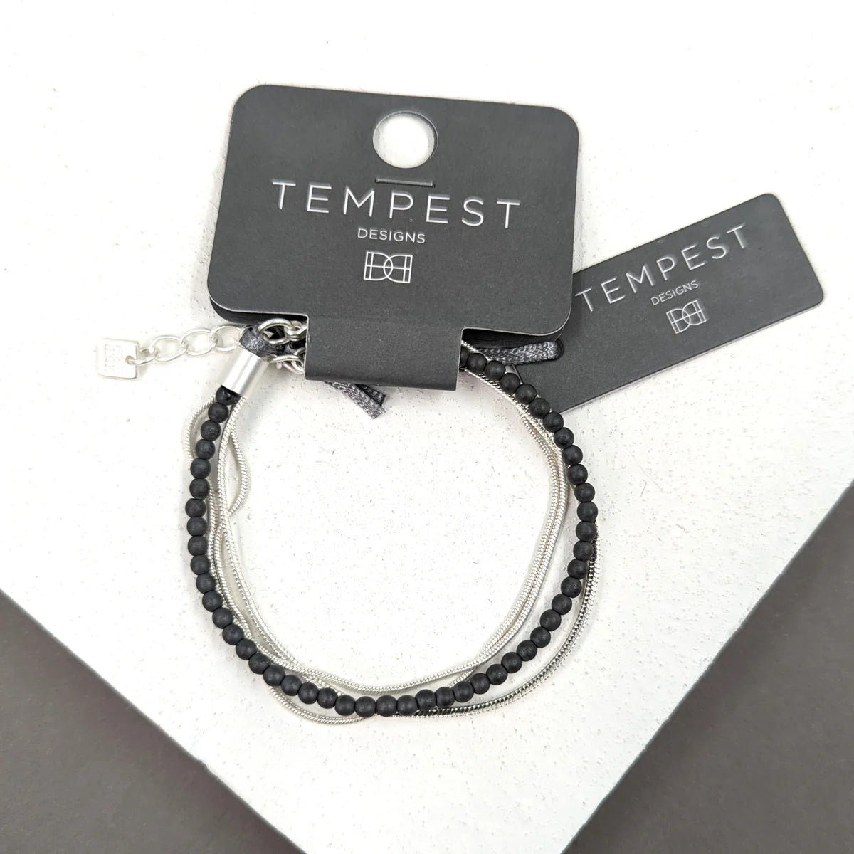 A stylish multi strand silver snake bracelet with a single strand of grey beads, Will work equally for both casual or a night out.