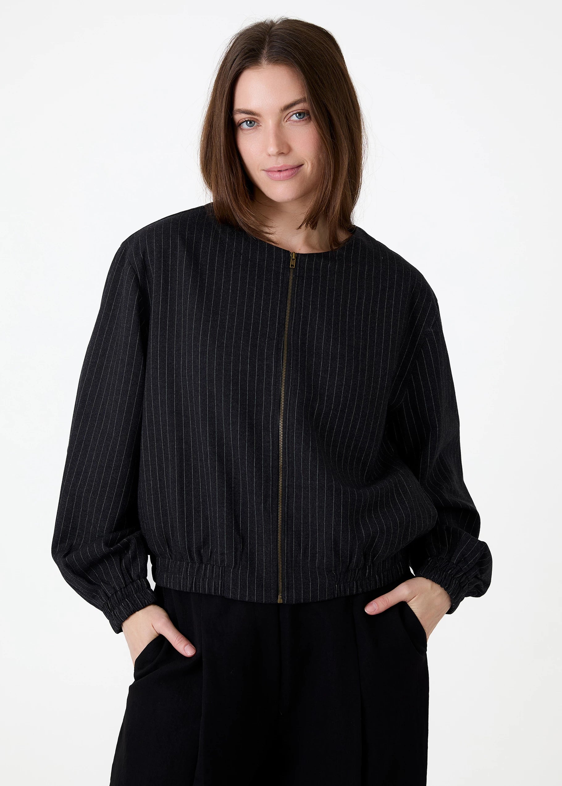 Pinstripe Zip Front Bomber Jacket - Charcoal & White