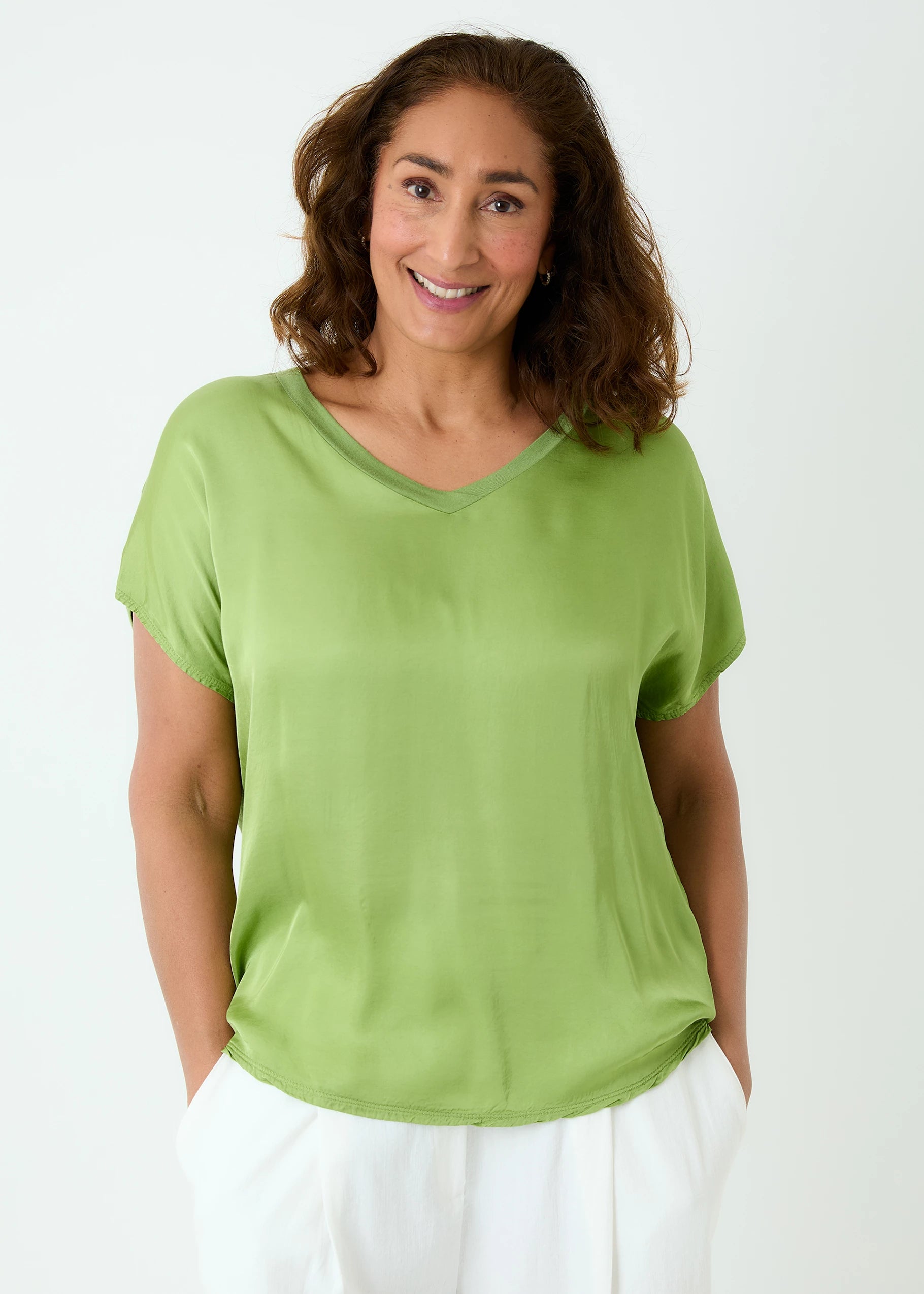 Product Description: Our satin front longline top is perfect for smart casual wear. It features a V-neck, short sleeves and soft jersey back. The perfect piece to take you from day to evening.