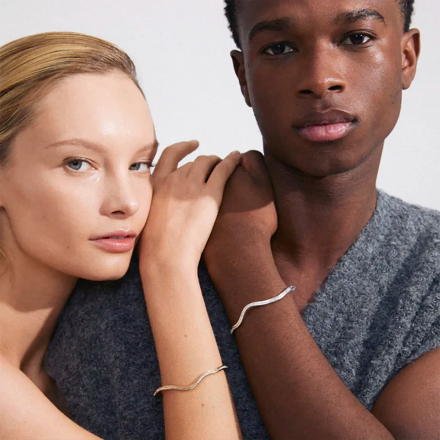 Description: This bracelet from Pilgrim features a uniquely irregular band that hugs the wrist comfortably. It has a smooth surface and small, round accents that run along one side, adding a delicate detail. With its minimalist design, it is versatile for both everyday wear and more formal settings.