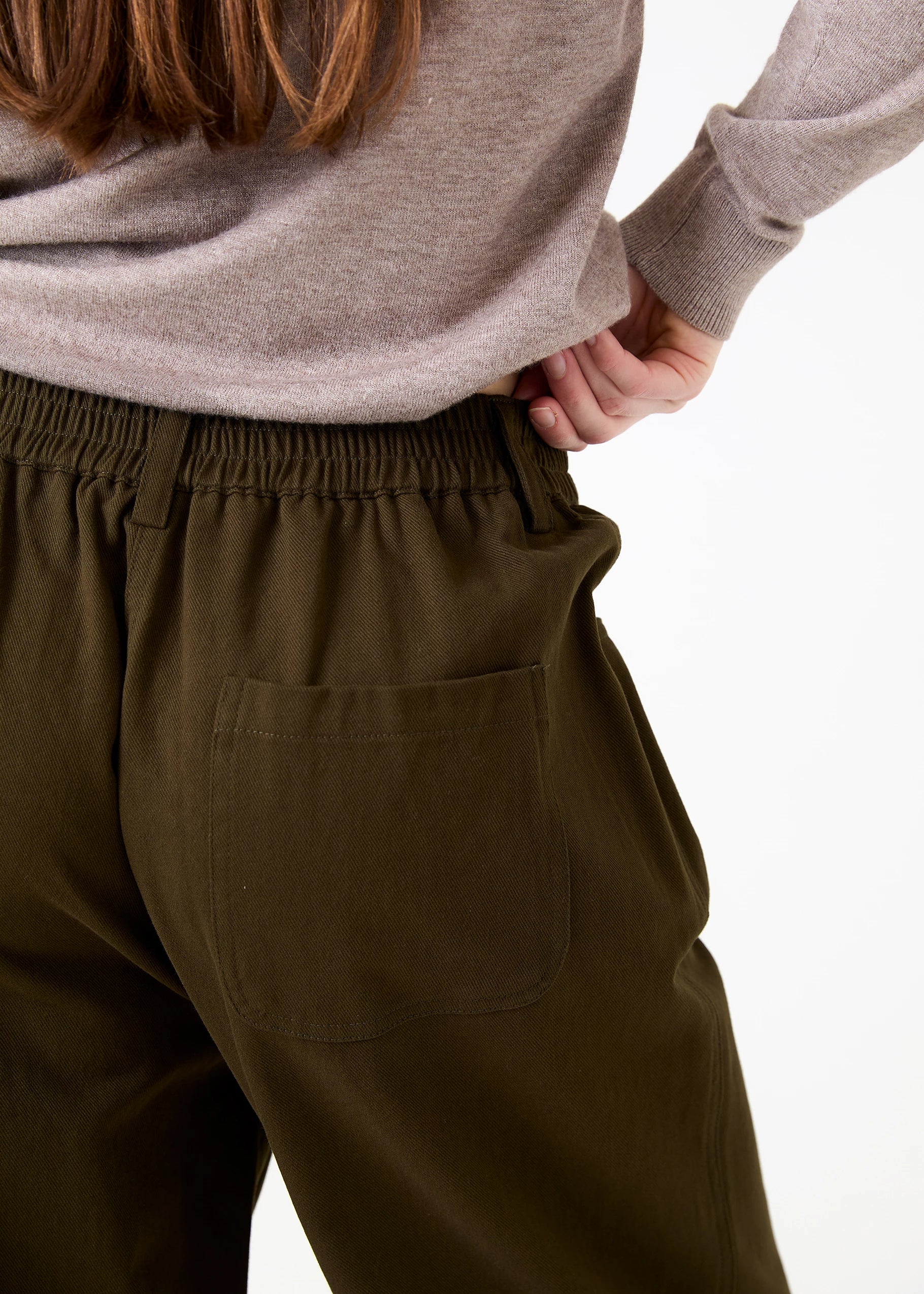 Cotton Twill Flat Front Elastic Waist Trouser - Khaki